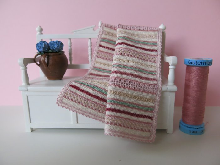 De poppenhuishobby is zó veelzijdig. Het ene moment zit je te zagen of te stoeien met elektra, het andere moment zit je te handwerken. Minihaken vind ik erg leuk (in het groot ook trouwens) en onlangs startte op facebook De Lossen & Vasten CAL (Crochet ALong) van Joke ter Veldhuis. Haar ontwerp sprak mij direct aan en met Gütermann-zijde en haaknaald 0,4 volg ik haar patroon. Hieronder het resultaat tot nu toe: